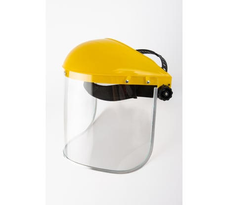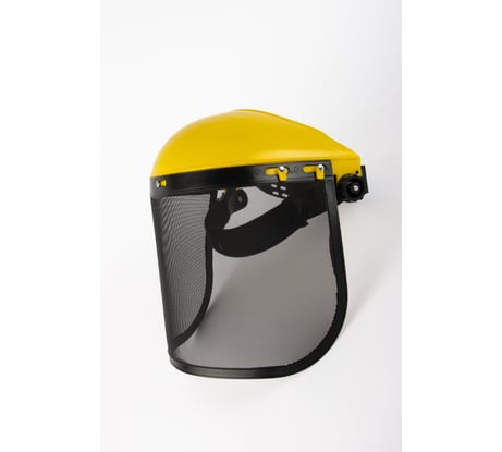 Экран из металлической сетки, очень удобно косить в нем триммером! Но лучше очки всё же одеть под щиток, и к мелкие песчинки могут попасть.