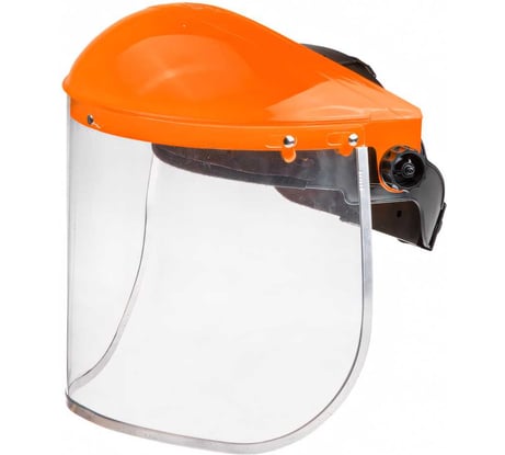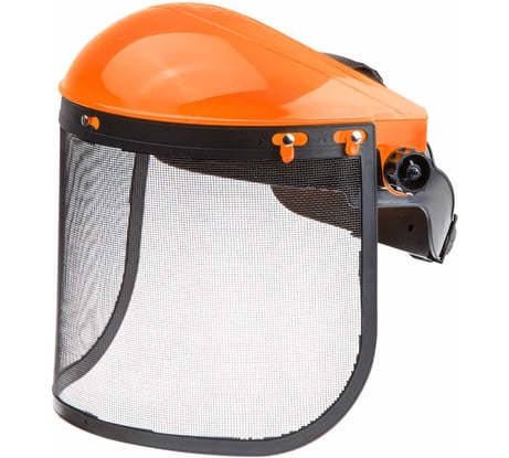 Щиток большой, закрывает и часть шеи, прозрачная часть не "играет" за счет алюминиевой рамки по краю. Не потеет, но под него залетают мелкие опилки. Из-за слишком широкого оранжевого козырька не очень удобно сидит на голове, опираясь оголовьем только на лоб и затылок, а боковых частей головы даже не касается. Регулировка не спасает. Ощущение, что проектировали его на футбольном мяче. Само оголовье выглядит хлипковато, но пока держится.