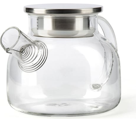 Нормальный заварочный чайник, расположение (высота) носика позволяет оптимально заполнять объём. Особенность - слегка зеркальное напыление поверхности мешает увидеть уровень воды. Неудобно, зато красивее, чем просто прозрачный.
