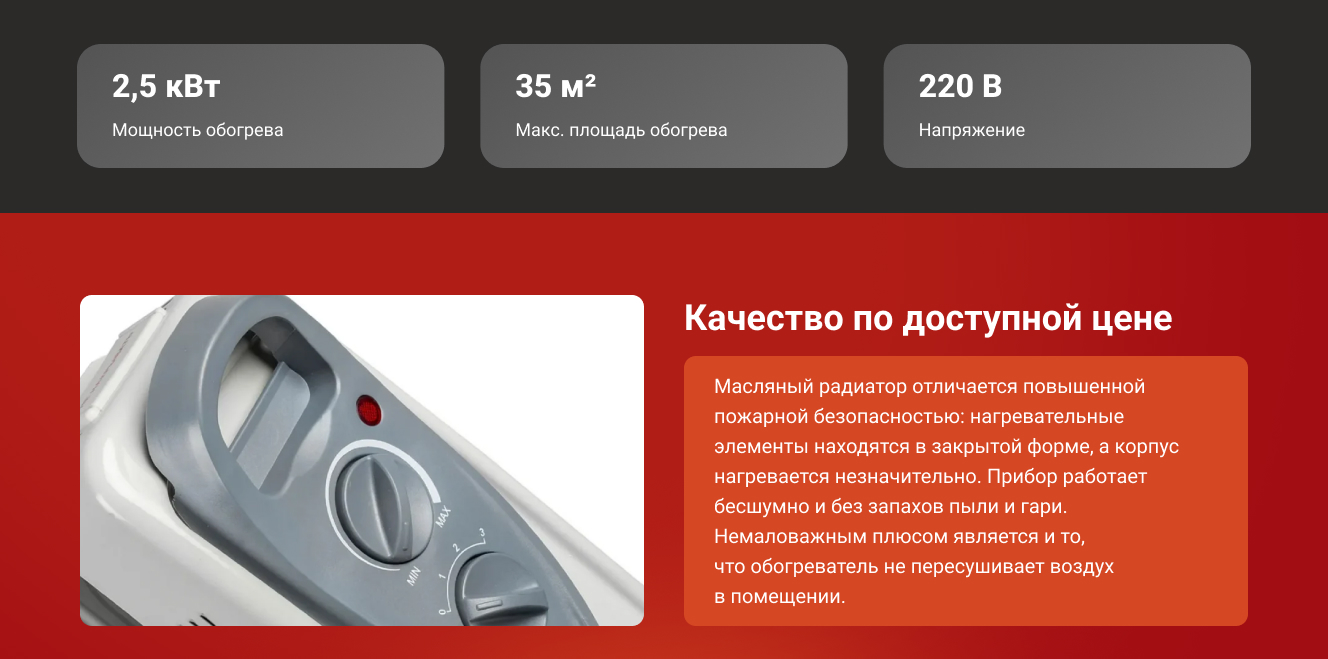 Забыл про холодные вечера! Комната становится теплой уже через минут 15. Управление интуитивно понятное, никаких сложных настроек. Работает тихо, не мешает спать. Сделан добротно, нет ощущения хлипкости. Покупкой доволен на все сто.