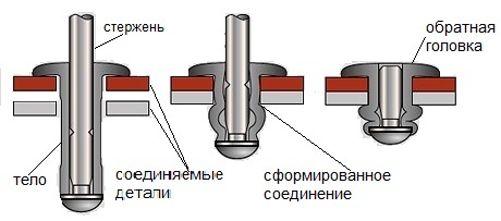 Стержень заклепки крепко захватывают рабочей частью инструмента – губками клепальной головки (рис. 1). Под силовым воздействием заклепочный пистолет протягивает стержень сквозь тело заклепки. Оно расширяется, и формируется соединение. Хвостовая часть заклепки деформируется и образует обратную головку на задней части деталей. Затем стержень обламывается.