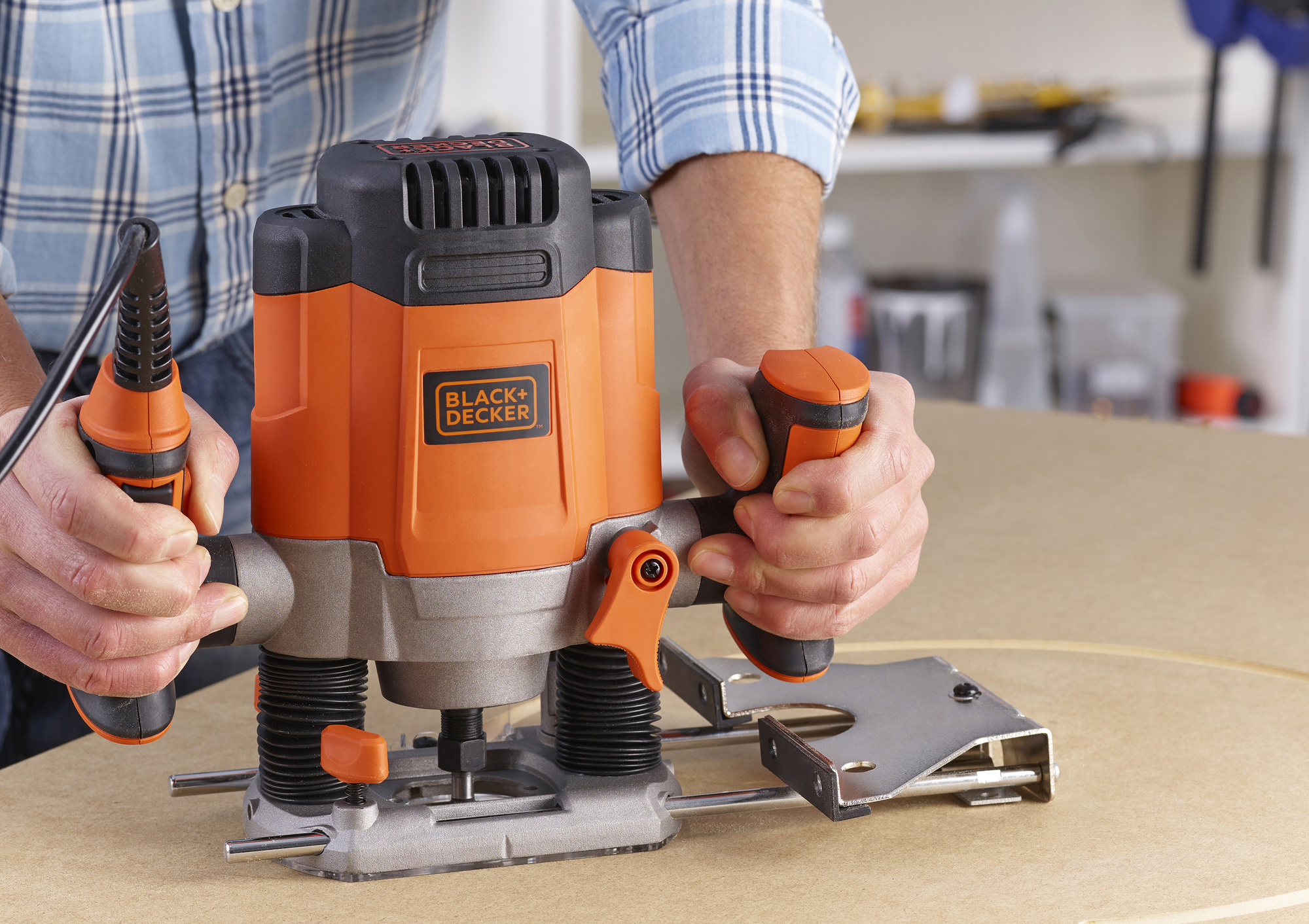 Фрезер BLACK+DECKER KW1200EKA – подойдет для хобби и небольшой частной мастерской. Имеет набор из 6 фрез для декоративной обработки поверхностей. Шаблон и копировальное устройство помогут выполнять однотипные операции с высокой точностью. Мощность составляет 1200 Вт, а ход фрезы – 55 мм, что обеспечивает продуктивность работ. Регулировка оборотов поможет подстроиться под любую задачу. Инструмент поставляется в кейсе для удобства хранения и транспортировки.