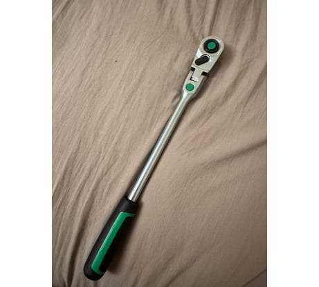 - В целом не очень аккуратное исполнение: * пин фиксирующий голову не равномерно забит - с одной стороны утоплен сильнее. * флажок-переключатель трет по корпусу головы при переключении. * наклонная головка имеет небольшой люфт во всех положениях головы - особенность исполнения - использован металлический штифт вместо шарика(как это сделано на Felo Ergonic K) и этот штифт не идельно заперает паз на головке(большие зазоры). Если бы сделали как на Felo, то думаю люфт был бы меньше. * Обрезинка ручки слишком короткая(для моей маленькой руки получается "в упор"), можно было сделать на пару сантиметров длиннее, либо сделать версию полностью металлической с накаткой вместо пластиковой ручки - получилось бы долговечней. * Механизм трещетки работает слишком туго, с жестким хрустом, как будто в нем нет смазки. * Уголок посадочного квадрата сколот(см. фото), видимо пострадал при транспортировке.