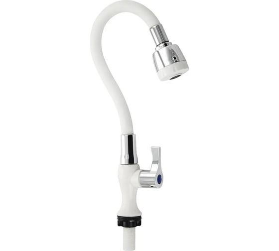Кран на одну воду из высокопрочного пластика АБС, белого цвета, с гибким изливом, с двухрежимным большим аэратором. Крепление резьба - гайка. Кранбукса м/к, ручка флажок, поворот на 90˚. Габаритные размеры: высота 310 мм, регулировка расположения излива 210 мм, диаметр посадочного седла 40 мм, длина резьбы 55 мм. В комплекте корпус, крепёж.