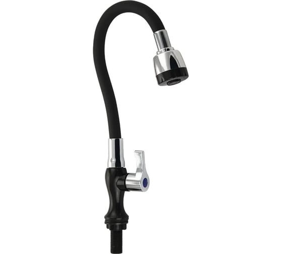 Кран на одну воду из высокопрочного пластика АБС, черного цвета, с гибким изливом, с двухрежимным большим аэратором. Крепление резьба - гайка. Кранбукса м/к, ручка флажок, поворот на 90˚. Габаритные размеры: высота 310 мм, регулировка расположения излива 210 мм, диаметр посадочного седла 40 мм, длина резьбы 55 мм. В комплекте корпус, крепёж.
