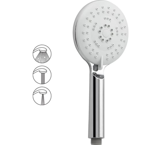 Душевая лейка круглая, отличается современным технологичным дизайном, высокой надежностью, долговечностью. Она изготовлена из влагостойкого пластика АБС и имеет декоративное покрытие цвета «хром», придающее устройству привлекательный вид и предохраняющее от агрессивного воздействия окружающей среды. Корпус отличается небольшим весом, что исключает повреждение напольной плитки или эмали ванны при случайном падении. Работает в трёх режимах с регулируемой интенсивностью: дождевая, обычная, струйный массаж. Ухаживать за душевой лейкой легко. Глянцевую поверхность достаточно протереть мягкой салфеткой, она в течение долгого времени не потеряет своего блеска. Система помогает мгновенно очистить силиконовые форсунки душевой лейки от известкового налета и загрязнения. Габаритные размеры: высота 240 мм, диаметр 120 мм, диаметр корпуса 30 мм.