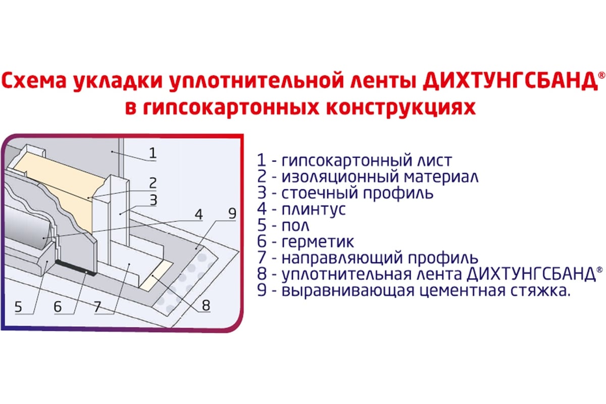 Дихтунгсбанд наклеивается на направляющий профиль (ПН), предназначенный для крепления к полу или потолку, а также стоечные профили (ПС), примыкающие к стенам.