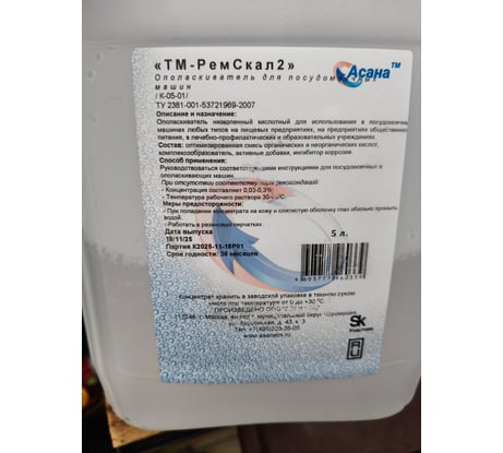 Ополаскиватель для посудомоечных машин ООО АСАНА ТМ "Рем Скал 2" 5 л К-05-01