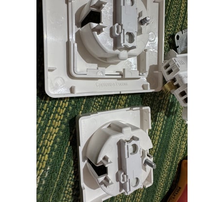 Розетки РАЗНЫЕ - часть с винтами для крепления, часть с саморезами для крепления поросенка. При этом на упаковках артикул олин и тот же gls 000 645. На самих розетках 00.4 и 000.4 как итог саморез закручен в гайку для болта, нормально он не прикрутился и выкрутить невозможно - две потеряные розетки.