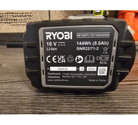 Основное достоинство - это мощные ячейки 21700 благодаря которым аккумулятор даёт повышенный ток, меньше греется и имеет компактные размеры. Что интересно на упаковке или в инструкции этого аккумулятора нет запрета на его использование с определёнными инструментами Ryobi как это есть с 9 амперными аккумуляторами.