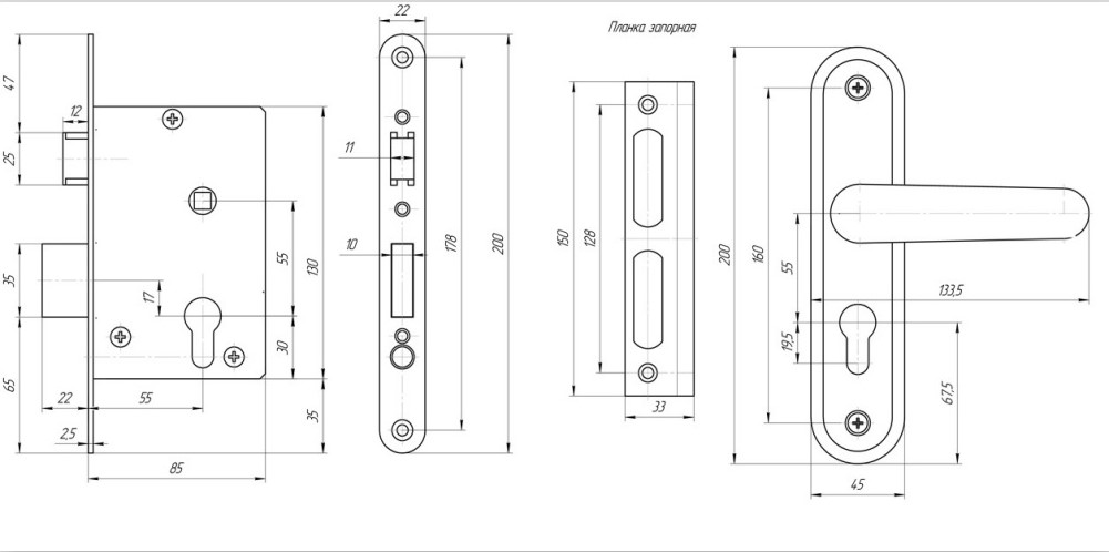 Замок врезной с ручками.Предназначен для установки в деревянные двери толщиной до 45мм, правого и левого открывания. Ригель прямоугольного сечения, вылет 22мм. Универсальная защелка. Стальной корпус, покрыт гальваническим покрытием. Межосевое расстояние 55 мм. Удаление ключевого отверстия 55мм. Материал ручек алюминиевый сплав.Комплектация: замок, цилиндровый механизм 70мм, 4 ключа, ручки, ответная планка, винтовые стяжки.