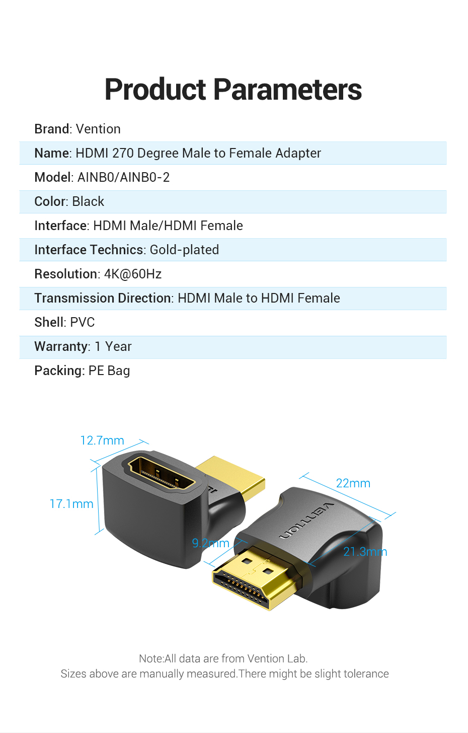 Технические характеристики VENTION HDMI v2.0 19M/19F угол 270 AINB0