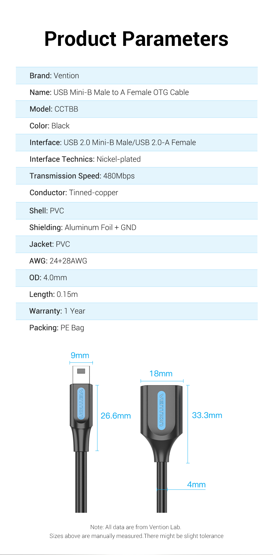 Технические характеристики VENTION OTG USB 2.0 AF/mini B 5pin - 0.15м CCTBB