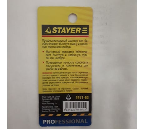 Технические характеристики комбинированного магнитного адаптера для бит STAYER 2671-60