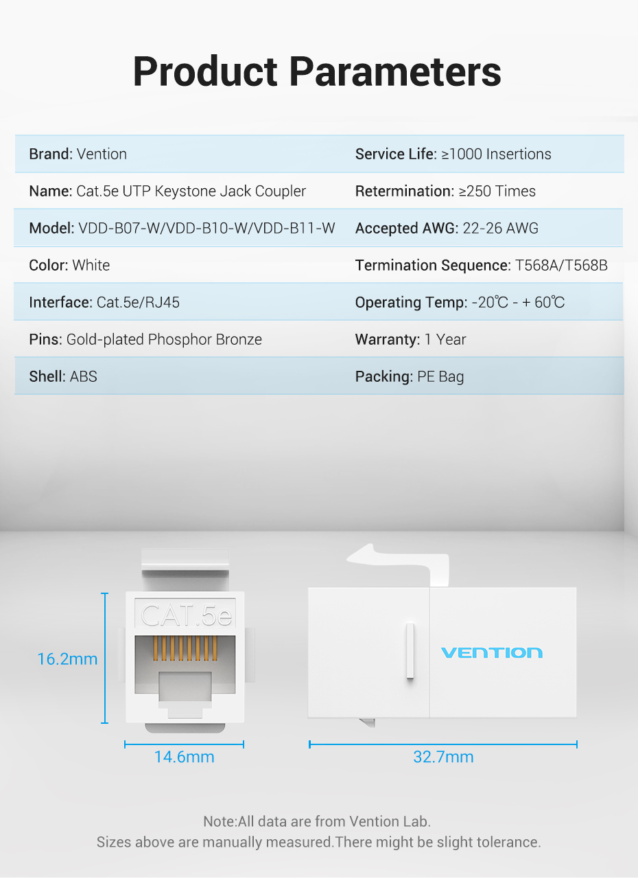 Технические характеристики VENTION RJ45 F / RJ45 F 8p8c кат. 5 VDD-B07-W