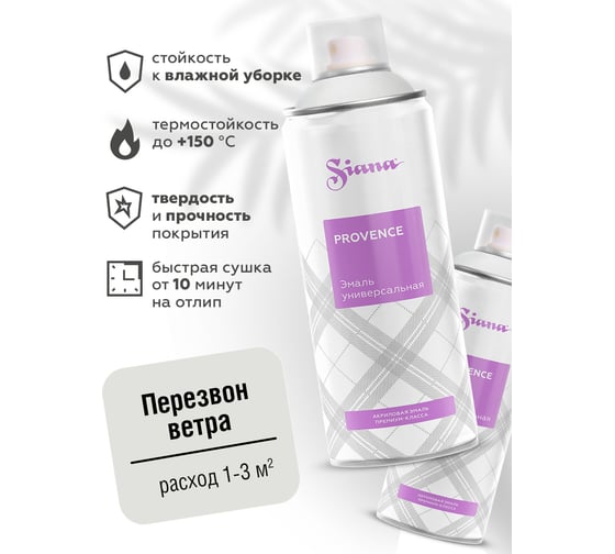 Аэрозольная акриловая краска в баллончике для декора SIANA Provence для мебели, металла, пластика, керамики, стекла, гипса, сухоцветов, цветов, радиаторов, быстросохнущая, перезвон ветра (светло-серый) SNP013 имеет распылительную головку с поворотным соплом, которая обеспечивает легкое и равномерное нанесение на сложные формы и вертикальные поверхности под любым углом. Сатиновый эффект аэрозоля создает приятную на ощупь бархатистую поверхность с мягким отражением света в помещении.