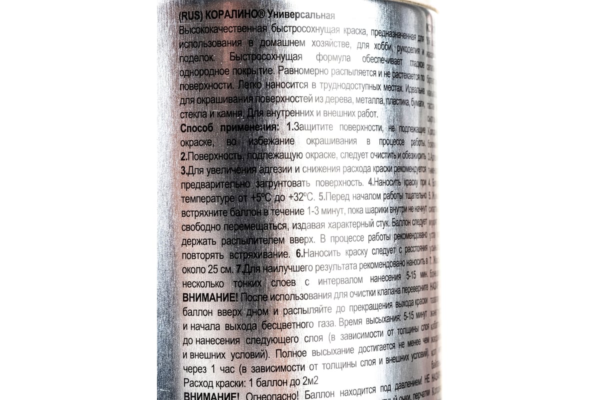 Аэрозольная краска CORALINO RAL1015 Светлая слоновая кость C11015 предназначена для быстрого и легкого окрашивания всевозможных изделий из различных материалов. Быстросохнущая формула обеспечивает гладкое однородное покрытие. Финишное покрытие обладает стойкостью к воздействиям внешней среды, УФ-излучению. Равномерно распыляется и не растекается по поверхности. Легко наносится в труднодоступных местах. Для внутренних и внешних работ. Соответствует заявленному номеру стандарта RAL.