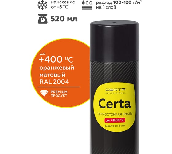 Аэрозольная краска термостойкая антикоррозионная до 400С оранжевый, RAL 2004, 520мл Certa CPR00090 CST00090