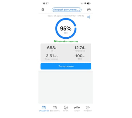 При покупке акб DELTA 95 A AGM БЫЛ СРАЗУ СДЕЛАН ТЕСТ и он показал 12.65 V, пусковой ток 915 из заявленных 850 сопротивление 3.70, хорошая АКБ!!! ЗАРЯД 98%