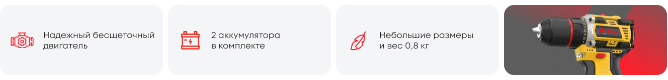 Особенности: - бесщеточный энергоэффективный двигатель; - высокий крутящий момент; - две скорости вращения; - реверс (возможность переключать направление вращения); - светодиодный указатель заряда аккумулятора; - возможность установки значения крутящего момента и функции сверления; - быстрозажимной патрон; - компактный; - подсветка рабочей зоны; - удобство (рукоятка с прорезиненными вставками).