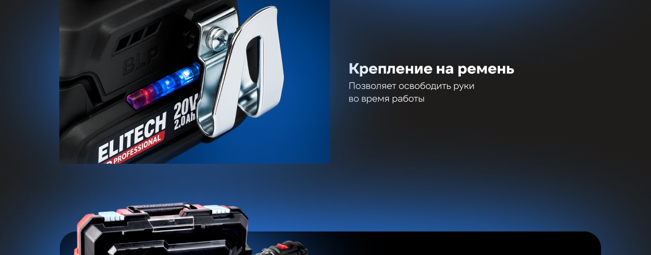 Входит в аккумуляторную платформу ELP (Elitech Lithium Platform), которая обеспечивает снижение нагрева и увеличение жизненного цикла аккумуляторов, принудительное охлаждение и контроль всех параметров батареи во время зарядки.