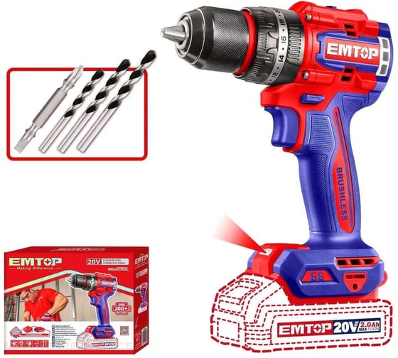 Аккумуляторная компактная бесщеточная ударная дрель-шуруповерт emtop ECIDL206681