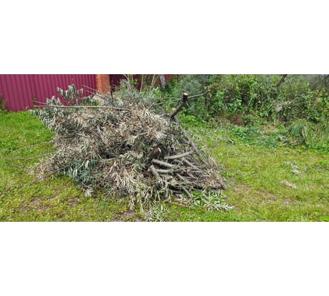 Не мешает провод от розетки и не пахнет бензином. Устройство натяжения цепи отлично себя показало в работе. На фотографии пиленные деревья с участка, на всю эту кучку ушло два деления индикатора заряда батарей. Батареи 4АЧ.