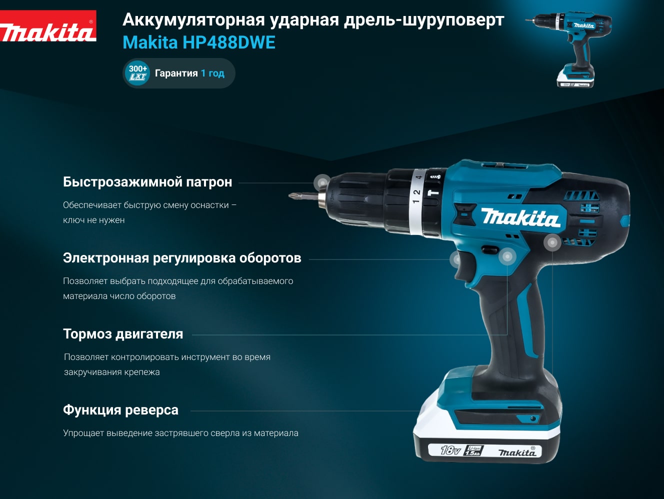 Аккумуляторная ударная дрель-шуруповерт Makita G-серия HP488DWE