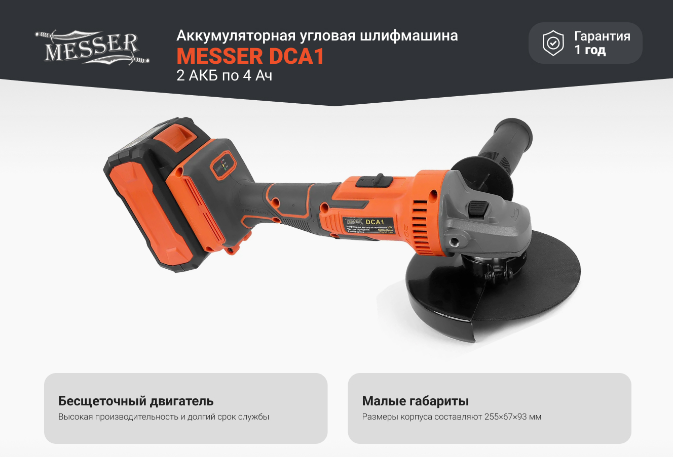 Аккумуляторная угловая шлифовальная машина MESSER DCA1 125 мм, 20В, 4Ач 10-43-014
