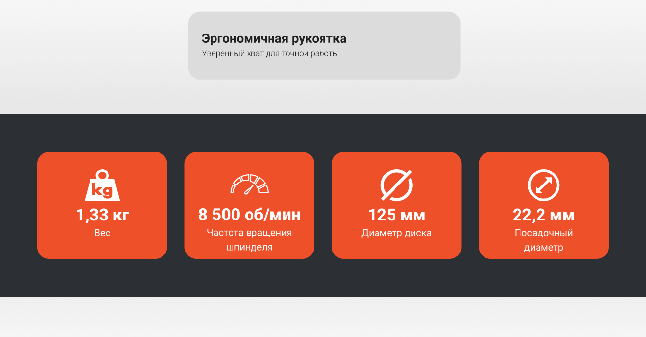 - Эргономичная прорезиненная рукоятка позволяющая надежно и комфортно держать ушм даже оператору с небольшой ладонью