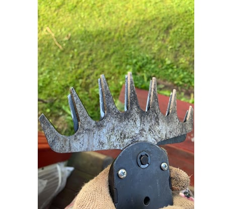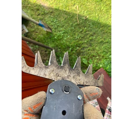 Отлично стрижет туи и крайние ветки елок. Грабли как рыхлитель вокруг цветов и помидор тоже вполне хорошо делают, только вибрация на руку чувствуется, удобнее в перчатке работать. Наличие телескопической трубки большой плюс.