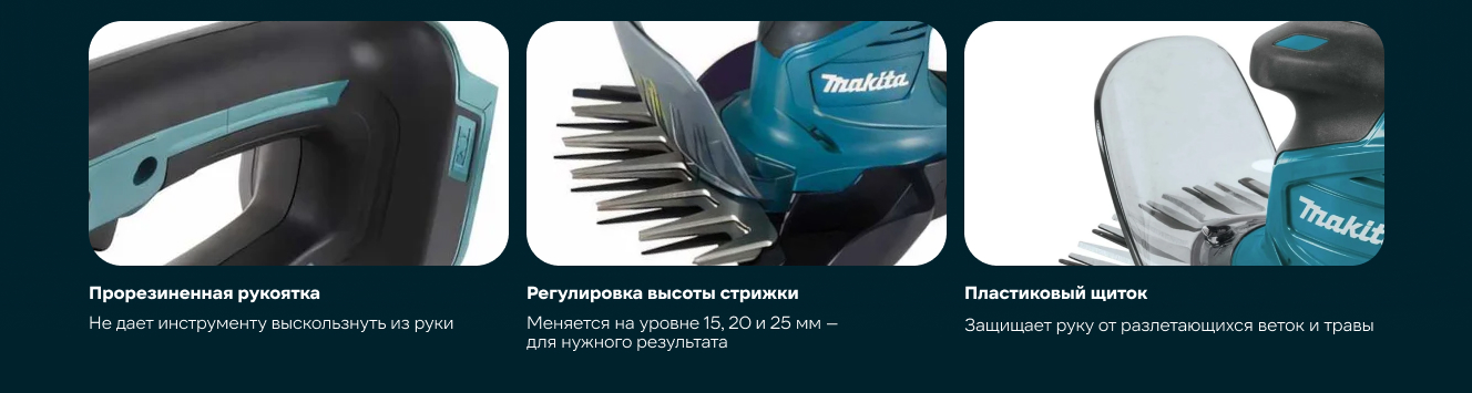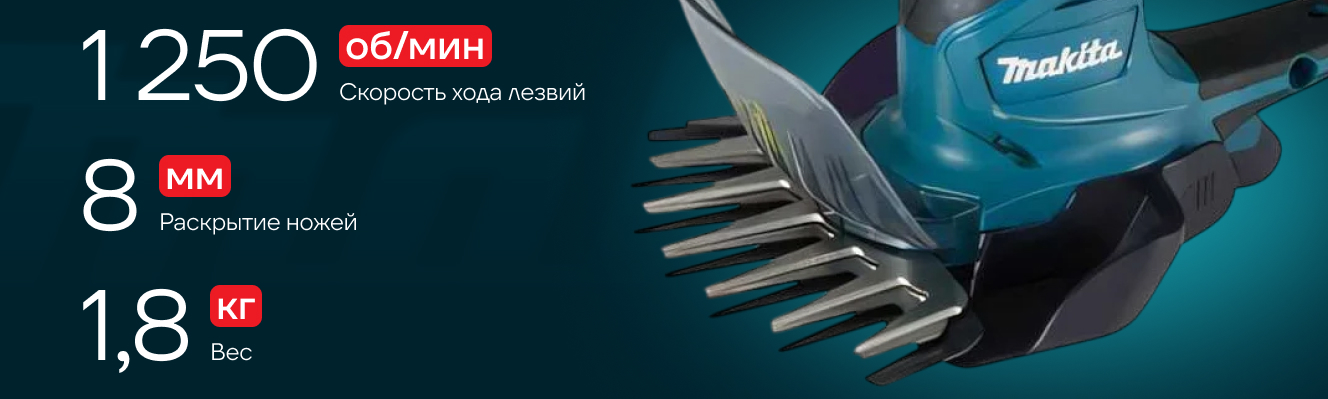 * единая экосистема 18В LXT-инструмента MAKITA (у меня 6 аккумуляторов 5 а.ч., а так же пара 2-х а.ч. и такая же - 3 а.ч. ) * мощный двигатель, особливо учитывая минимальные зазоры между ножей как ножниц, так и ножа-кустореза (ветки/стебли не более 10-12мм) - всё, что залезло под ограничители - сбривает "в-ноль" и без особого напряга (на "сухостой" в 10-12мм инстрУмент не натравливал - таки своё, жалко - да и зачем такое извращение...) * ручка удобная, руку при работе практически не трясет * инструмент из породы малопрожорливых - даже 2 а.ч. батарей хватает надолго * чрезвычайно оборотистый - подлезть можно везде и сбрить такое, что косе/большим ножам-кусторезам не добраться * при использовании соотв. приспособы (немедленно прикупил такую, арт. 198516-8) - можно стричь не нагибаясь внизу (а так же, при наличии такого желания, выше (почти на метр, чем можно руками достать)) траву/веточки - удобно... * и ножницы, и нож можно приобрести отдельно (если затупится и наточить будет проблемно) * "совочек" для сбора постриженной "мелочи" (такой комплектный (!) есть и для ножниц, и для ножа-кустореза) - совсем не бутафория, очень практично и удобно