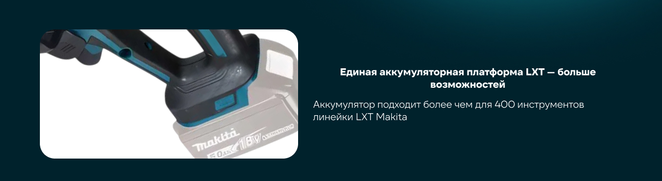Ножницы для травы работают на аккумуляторной платформе LXT. Данный тип аккумулятора подходит более чем для 400 инструментов Makita из линейки LXT, а это значит, что его можно использовать не только с садовым инструментом, но и с шуруповертами и перфораторами Makita.