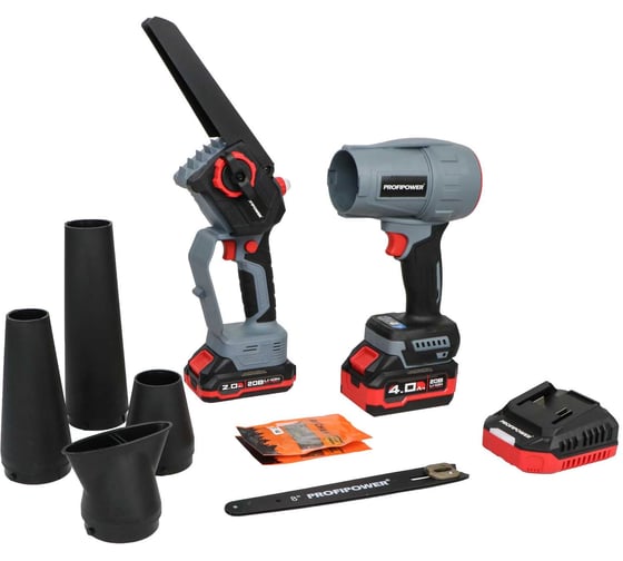 Комплектация:Цепная пила ,Воздуходувка, Li-ion-2шт, 20B, 2.0Ач, 4.0Ач, в коробке 3 насадки, 2 цепи, шина 8 зарядное устройство