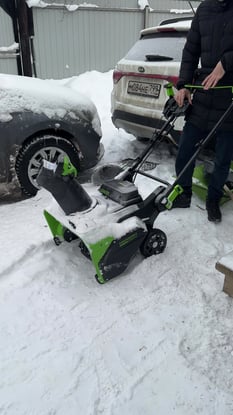 Имея желание купить снегоуборщик несколько дней изучал различные модели. Предпочитание отдал аккумуляторному варианту и, после анализа, выбрал модель GreenWorks GD82ST с аккумулятором на 5А. После некоторых консультаций с менеджерами по характеристикам, вариантам оплаты, за что им отдельное спасибо, буквально на следующий день после оформления заказа была осуществлена доставка. Все на дОлжном уровне. Собрал быстро там все понятно. С ноября, с первых снегов, снегоуборщик в эксплуатации. Снега выпадало достаточно много, чтобы опробовать с полной нагрузкой. Впечатление просто прекрасное. Толкается легко, несмотря на вес, чистит прекрасно, причем любой снег. Тут надо понимать, что это все таки не бензиновый и не самоходный вариант. Площадь очистки 150-200 кв.м. и зарядки одного аккумулятора на 5А хватает. На всякий случай в запас купил на ОЗОНе запасной ремень и дюралюминиевый скребок на случай повреждения штатного пластикового (примерял, подходит четко). Очень удобная ручка управления раструбом выброса снега. Фары освещают достаточно. Снег бросает достаточно далеко, мокрый, конечно, существенно ближе. Шнек вполне надежный, каркас металлический, лопасти- транспортерная лента, что внушает доверие. Зарядка аккумулятора, действительно, достаточно быстрая, чуть больше часа. Большого шума во время работы нет. По времени экономит в сравнении со скребком и лопатой раза в 3-4, не говоря о том, что в принципе не устаешь. Так что если кто рассматривает этот вариант снегоуборщика не пожалеете.