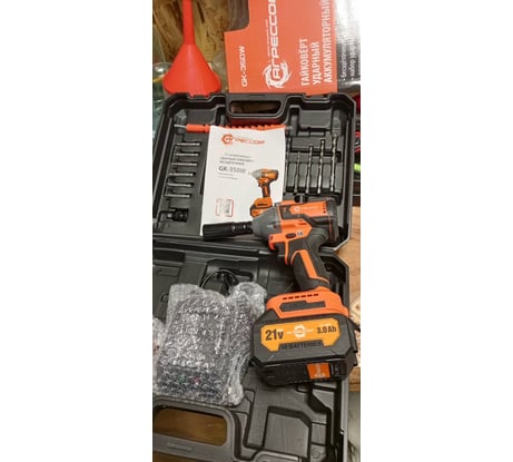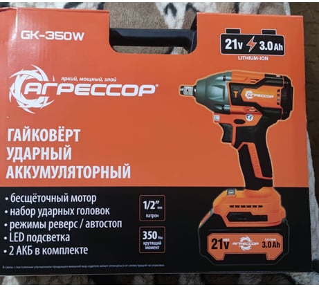 Аккумуляторный гайковерт Агрессор 350 Nm, 21V/3А, бесщеточный мотор, АКБ 2 шт., зарядное устройство 220В, набор насадок 25 шт., пластиковый кейс. GK-350W