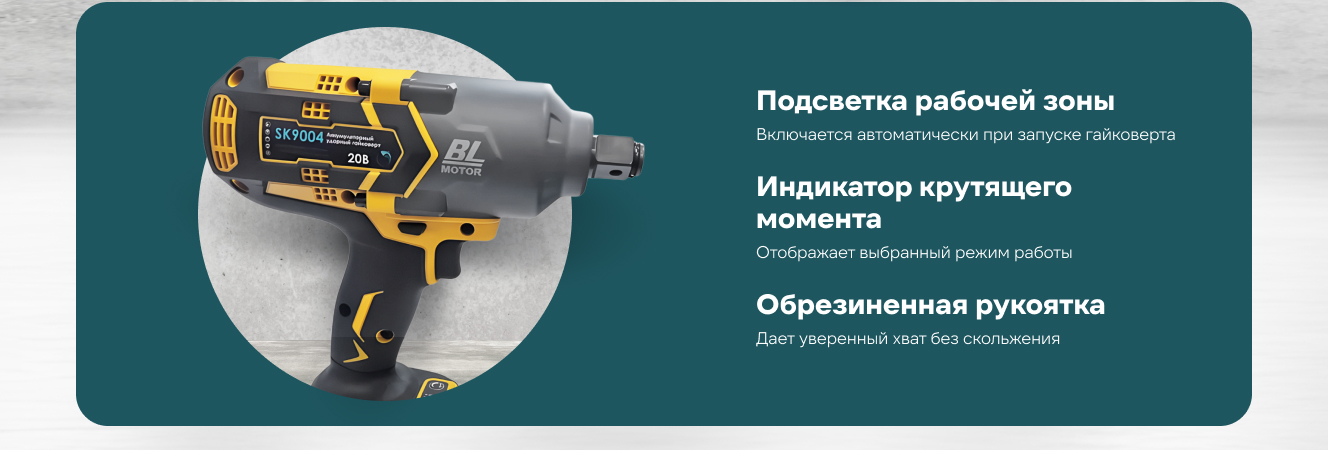 Корпус гайковерта выполнен из высококачественного пластика, рукоятка обрезинена, имеется подсветка рабочей зоны.