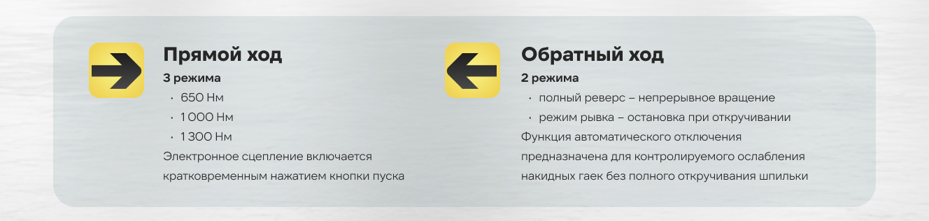 На корпусе расположена регулировка (индикатор) крутящего момента. Данный индикатор имеет 3 режима: 650Нм/1000Нм/1300Нм.
