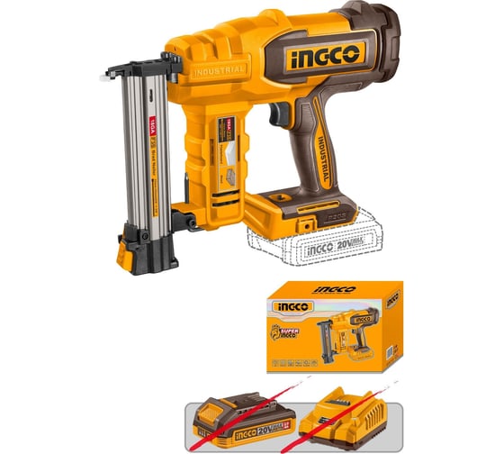 Аккумуляторный гвоздезабиватель нейлер INGCO CBNLI2005 INDUSTRIAL предназначен для строительных работ, мебельного производства, ремонта, производства тары и упаковки, обеспечивает комфортную работу без использования кабеля, компрессора, шлангов или газовых картриджей.