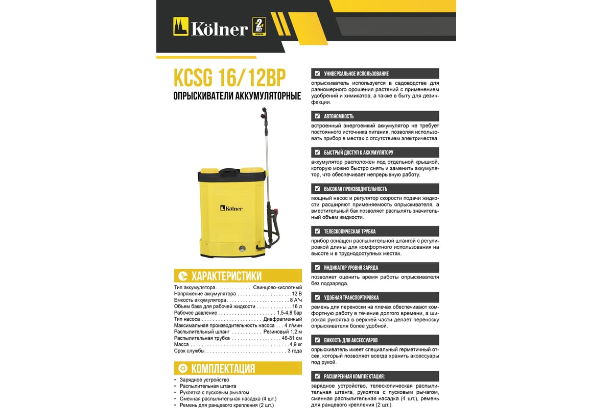 Аккумуляторный опрыскиватель Kolner 12 Вт, 8 А*ч кн16-12брцсг используется в садоводстве для равномерного орошения растений с применением удобрений и химикатов, а также в быту для дезинфекции.