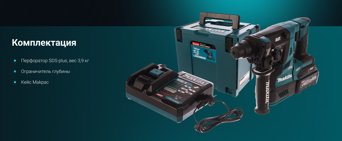 Аккумуляторный перфоратор Makita XGT HR001GM201 199375 отличается высокой надежностью в работе. Имеет три режима: сверление, ударное сверление, долбление. Источником питания служит литий-ионный аккумулятор 40 В.