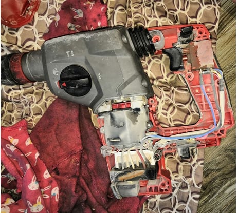 При монтаже на потолке очень сильно раздувает шлам, как и все перфораторы. С насадкой пылесборником становится громоздким. Есть износ пластика в месте стыковки аккумулятора, из-за постоянных вибраций. Защита оператора от вибрации так себе, могли сделать двойной разрыв.
