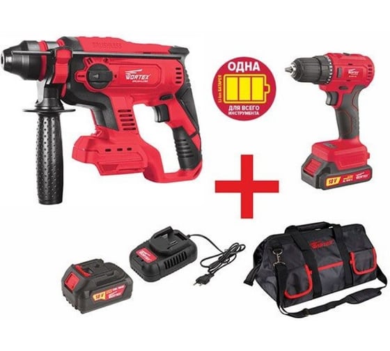 Набор инструментов WORTEX CRH 1820-1 XLT и BD 1815-1 DLi включает аккумуляторный перфоратор и аккумуляторную дрель‑шуруповерт, предназначенные для выполнения широкого спектра бытовых задач, связанных со сверлением и монтажными работами. Перфоратор аккумуляторный WORTEX CRH 1820-1 XLT оснащён бесщеточным двигателем, работает от аккумулятора 18 В и поддерживает два основных режима: сверление и сверление с ударом. Конструкция предусматривает использование патрона SDS‑plus, максимальная энергия удара составляет 2,2 Дж, а частота ударов достигает 4250 уд/мин. Диаметр сверления в бетоне составляет 20 мм, в стали — 13 мм. Лёгкий корпус массой 1,7 кг облегчает использование инструмента в ограниченных пространствах и при выполнении работ над головой.