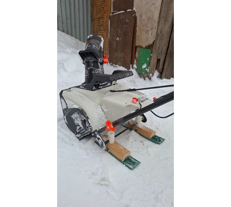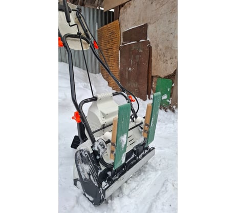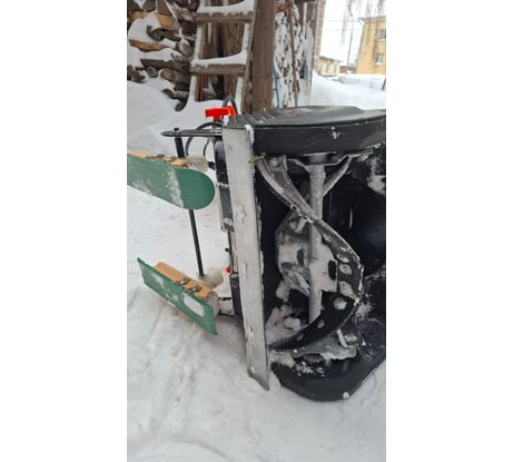 Техника норм . Пришлось малость доработать. Колёса заменил на лыжы и скребок спереди снизу наржевейкой обтягул . 2 окума хватает на 9 соток ( тропинки дорожки , проезды, место машины ) . Апарат устраевает!