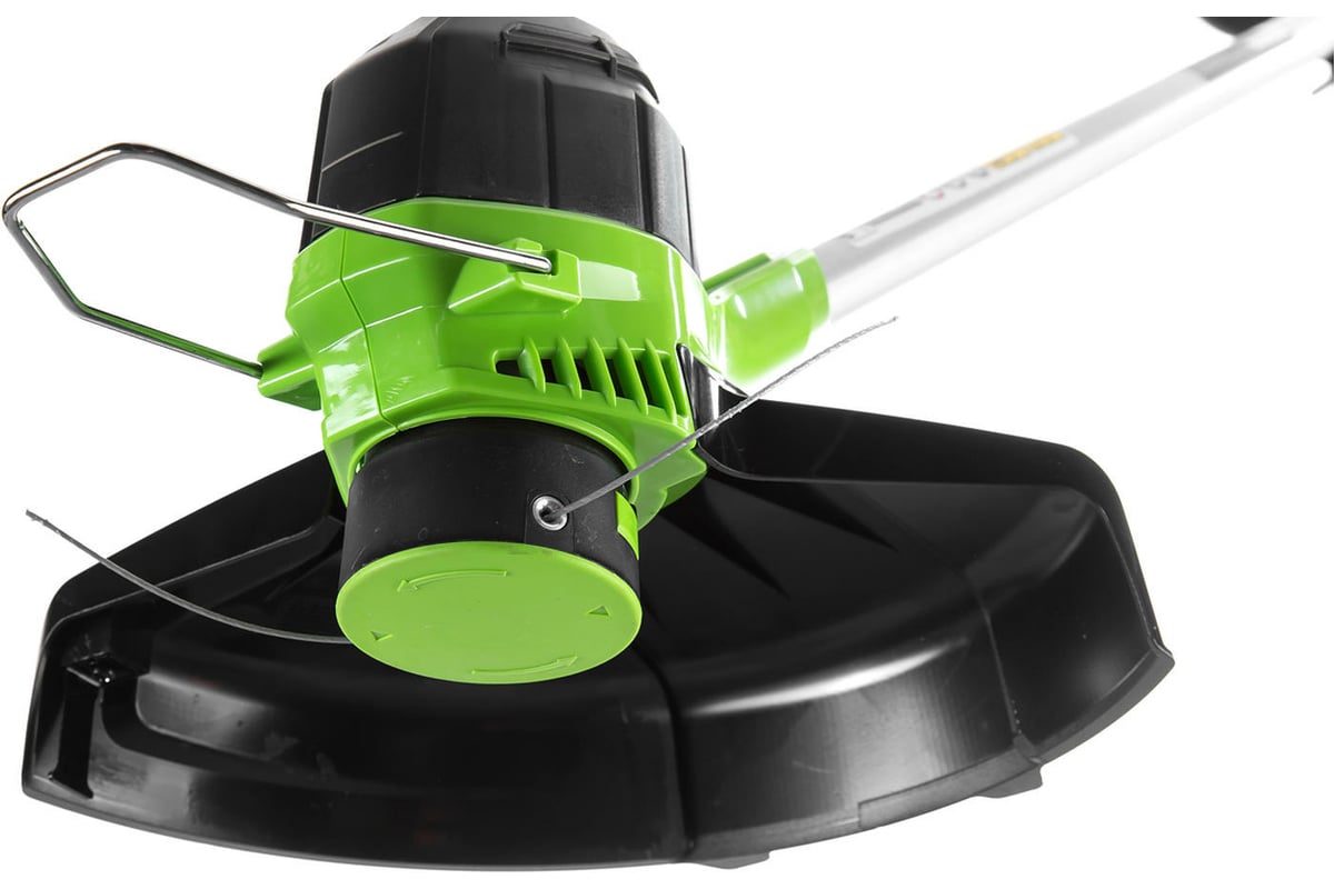 - Кожух аккумуляторного триммера Greenworks G40LT30 защищает пользователя от скошенной травы;