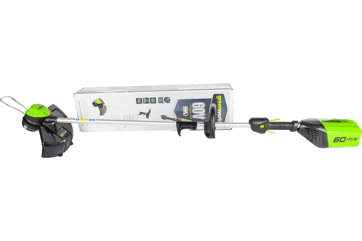 - Разборный вал - удобство хранения и транспортировки аккумуляторного триммера Greenworks GD60LT;