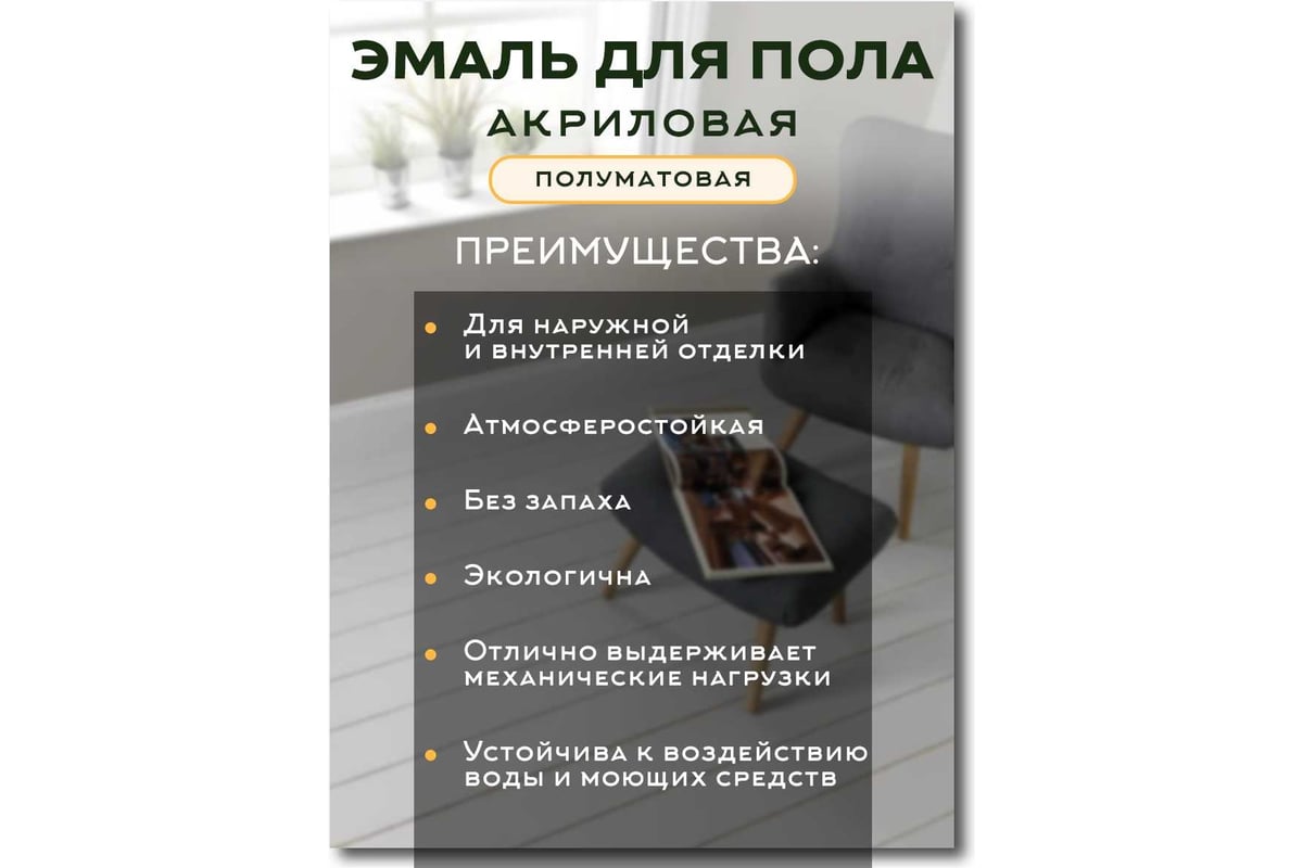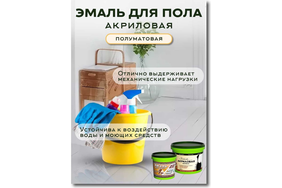 Акриловая эмаль для пола White House (темный шоколад; 2.2 кг) 15874Эмаль акриловая для пола White House – быстросохнущая полуматовая эмаль на водной основе. Краска для пола применяется для окрашивания деревянных, бетонных, кирпичных, минеральных поверхностей. Краска эмаль предназначена для окраски деревянных и бетонных полов всех типов зданий и сооружений, а также полов снаружи помещений, защищенных от прямого воздействия осадков соответствующими конструкциями. Краска для полов устойчива к воздействию воды, бытовых моющих средств, поэтому может использоваться для влажных помещений. Краска для пола без запаха быстросохнущая обладает высокой степенью экологичности и безопасности, рекомендована для применения в детских, лечебных учреждениях, а также в помещениях, где проводится влажная дезинфекция. После высыхания эмаль для пола образует гладкую, полуматовую поверхность. Благодаря высоким декоративным свойствам акриловую эмаль активно используют для создания интерьера жилых и офисных помещений. Водоотталкивающая, стойкая к истиранию эмаль акриловая отлично выдерживает механические нагрузки. Краска эмаль для пола устойчива к перепаду температур, что обуславливает её широкое применение при окрашивании веранд, террас, беседок, пристроек, лестниц, бетонных полов в мастерских. Краска практически не пахнет, легко наносится и быстро сохнет. Перед использованием тщательно перемешайте эмаль для пола без запаха, при необходимости разбавьте водой, но не более чем на 5%.