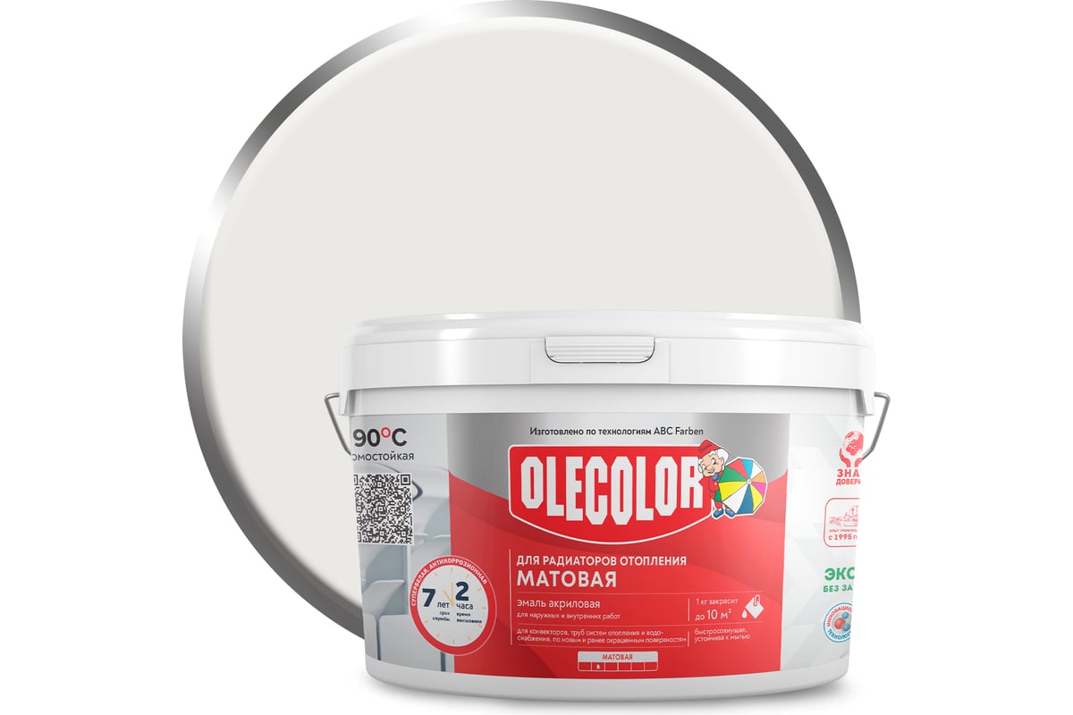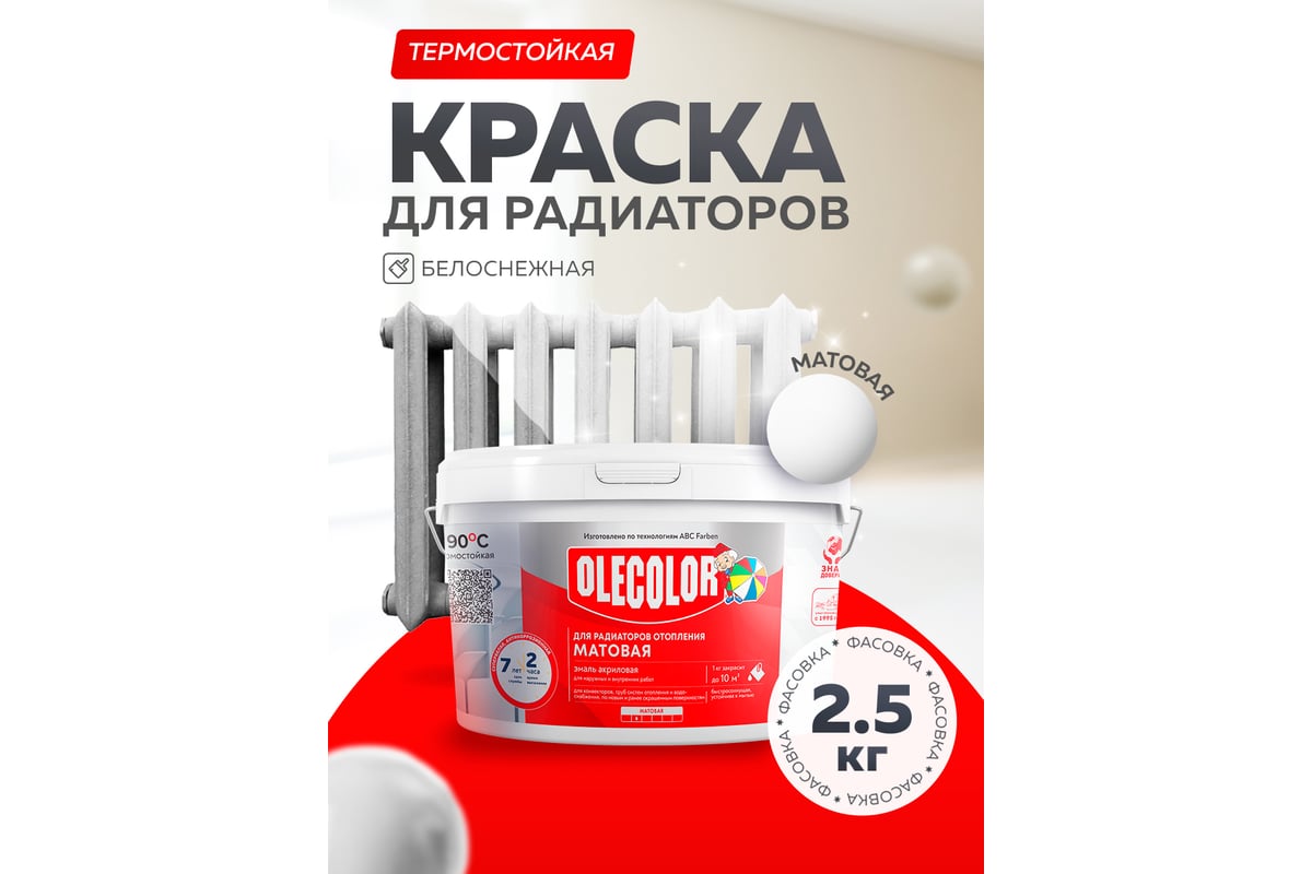 Акриловая эмаль для радиаторов отопления OLECOLOR 2.5 кг 4300005664 предназначена для защитно-декоративного и экологичного окрашивания радиаторов, конвекторов, а также труб систем отопления и водоснабжения, по новым и ранее окрашенным поверхностям.