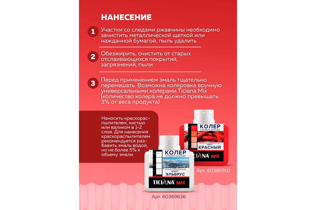 Покрытие выдерживает нагревание до +90 градусов, при этом не желтеет, сохраняет стойкий белый цвет. Эмаль наносят кистью, валиком или краскораспылителем на подготовленную сухую, чистую поверхность. Возможность колеровки вручную универсальными колерами Ticiana Mix позволяет получить любой желаемый оттенок.