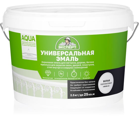Акриловая эмаль ЭКСПЕРТ полуматовая, белая, База А, 2.5 кг 27567 - универсальная экологичная эмаль для окраски окон, дверей, плинтусов, стен из металла, древесины, бетона внутри и снаружи помещений. Состав служит для наружных и внутренних работ.